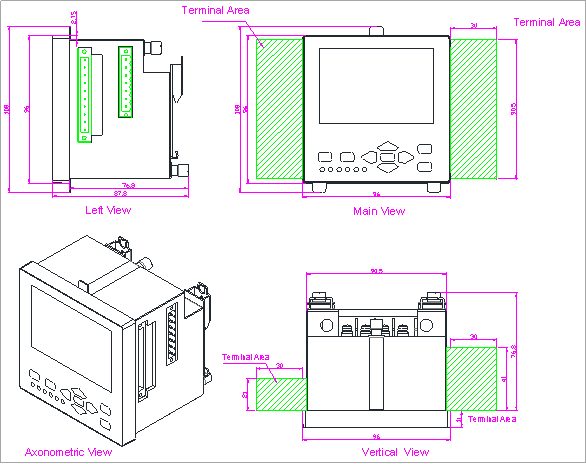 -Standard DIN 96 x 96 mm front panel, 91 x 91 x 80 mm body dimensions, suitable for 91x91 mm cut-out for surface mounting or DIN rail mounting