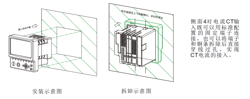 S 7 5 1 e电气智能终端采用标准9 2 x 9 2 m m开孔的安装结构和上下两侧弹扣式固定方式, 安装时只需要从安装板开孔正面推入即安装固定完毕, 拆卸时只需按住上下弹扣即可推出完成拆卸。如下图所示: