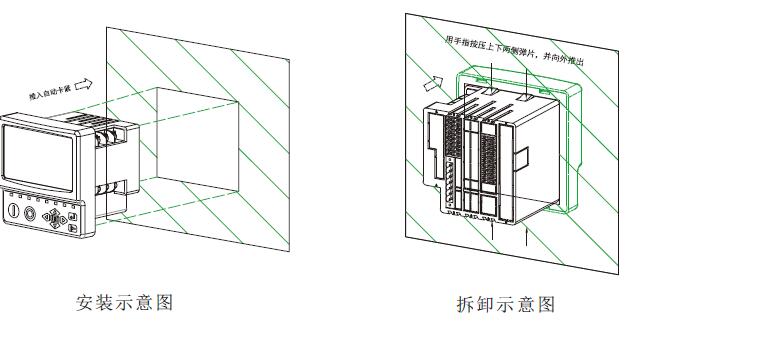 S 7 5 1 e - T电气智能终端采用标准9 2 x 9 2 m m开孔的安装结构和上下两侧弹扣式固定方式, 安装时只需要从安装板开孔正面推入即安装固定完毕, 拆卸时只需按住上下弹扣即可推出完成拆卸。如下图所示: