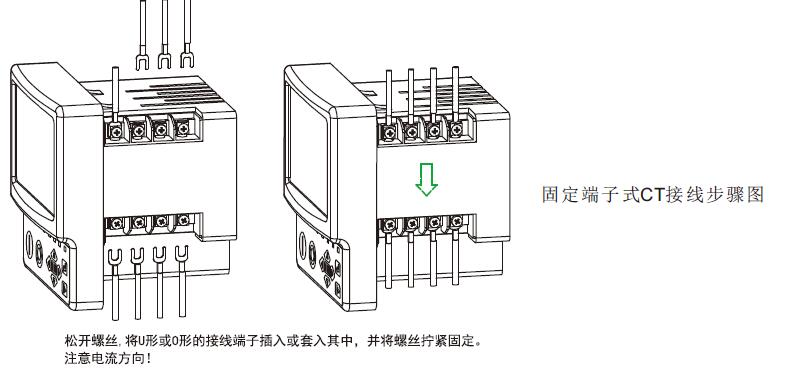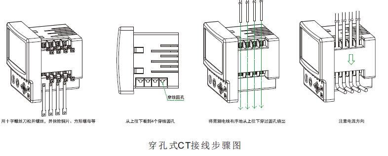 侧面4对电流CT输入既可以用标准配置的固定端子连接,也可以将端子和铜条拆除后直接穿线过孔,实现CT电流的接入。