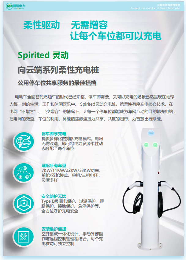 电动车全面替代燃油车的时代已经来临,停车即需要、又可以充电的场景已然呈现在地球人每一刻的生活、工作和休闲娱乐中。 Spirited灵动充电桩,携柔性有序充电核心技术,在电网“不增容”、“少增容”的情况下,让每一个停车位都能成为车网互动的目的地充电站,把电网的效益、车位的利用、补能的焦虑连接为共享、共赢的纽带,为智慧出行赋能。