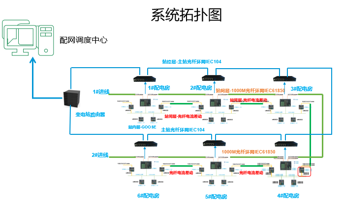 系统可通过IEC61850+GOOSE及光纤差动保护的方式实现站内,站间的信息交换与共享同时以常规保护为后备,实现站内及站间快速的故障隔离及恢复供电。