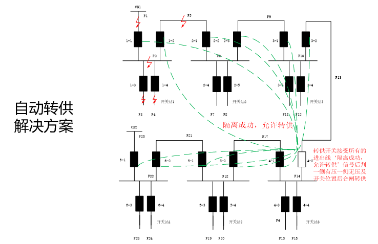 • 通过通讯测控单元网关的光纤环网通道将共享所有开关站转供信号,经GOOSE传输给转供开关,实现200ms内的恢复供电功能。